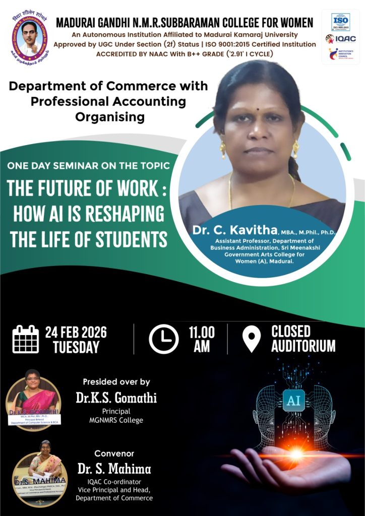 Department of Commerce with Professional Accounting has organised one day seminar on the topic “The Future of Work: How AI is reshaping the life of students” on 09.03.2026.