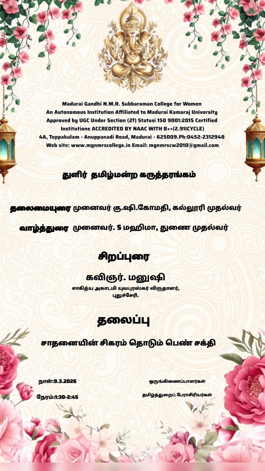 Department of Tamil has organised a one day seminar on the topic “சாதனையின் சிகரம் தொடும் பெண் சக்தி” on 09.03.2026.